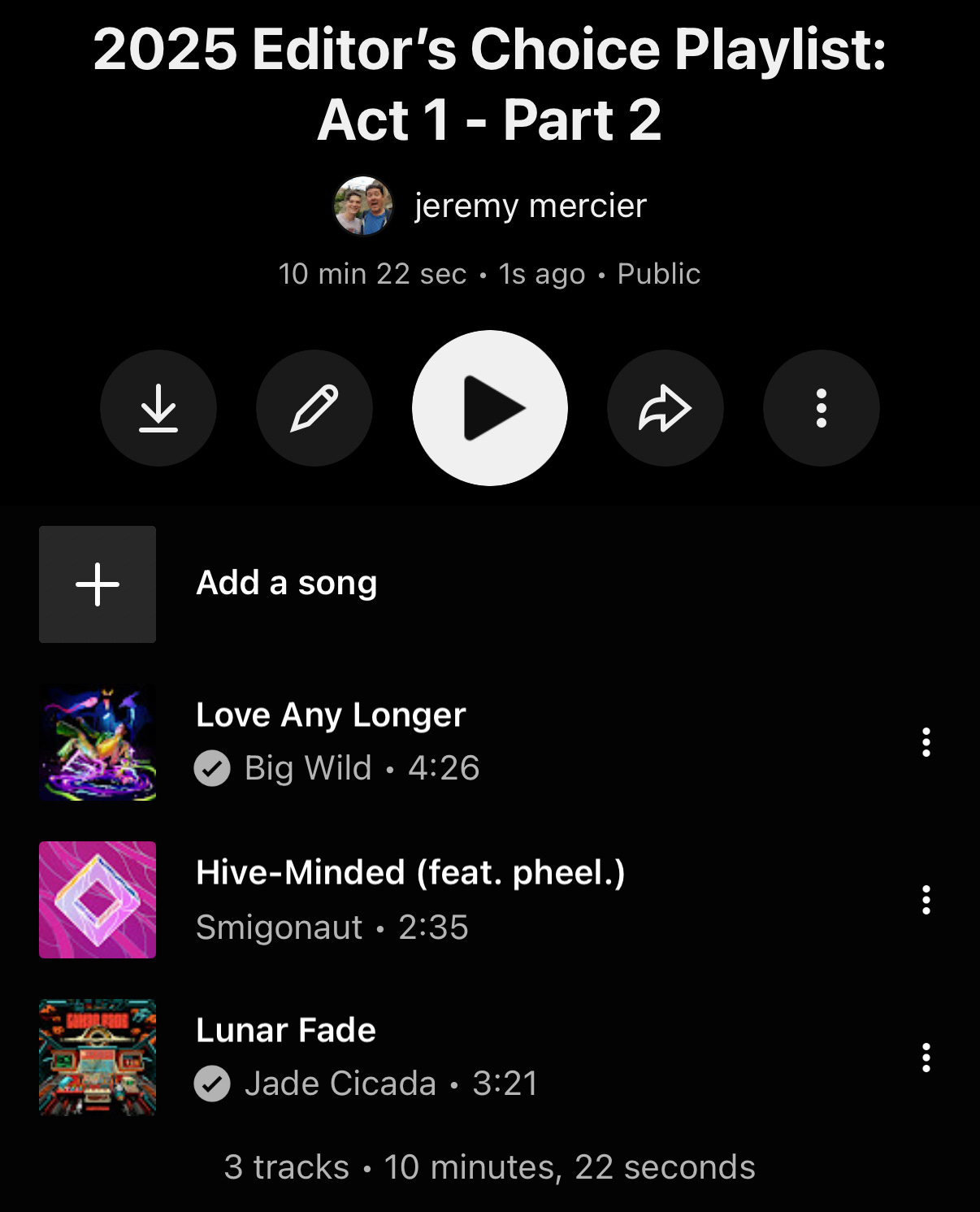 There are no lyrics to hang onto, just a sense of being pulled through a series of shifting rooms… one moment sparse and echoing, the next packed with cascading arpeggios and stuttering percussion. Positioned here, “Lunar Fade” acts as the trippy midpoint detour of Act 1 — a descent into the weirder corners of 2025’s sound before the playlist eventually climbs back toward clarity and emotional directness in the final third.