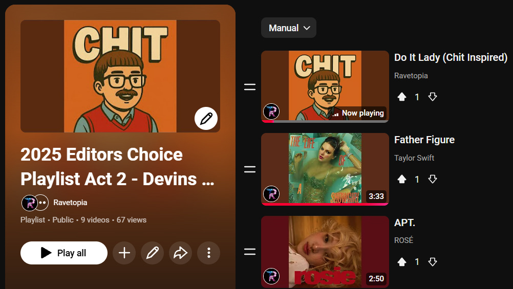 “Do It Lady (Chit Inspired)” kicks the door open with pure character energy — the kind of opener that doesn’t ask permission, it just arrives, shoulders first. It reads like Ravetopia putting a flag in the ground: this act is going to be playful, a little cocky, and fully committed to the bit. The “Chit Inspired” tag matters here — it frames the whole track like a persona-driven setpiece, where swagger is part of the arrangement.
