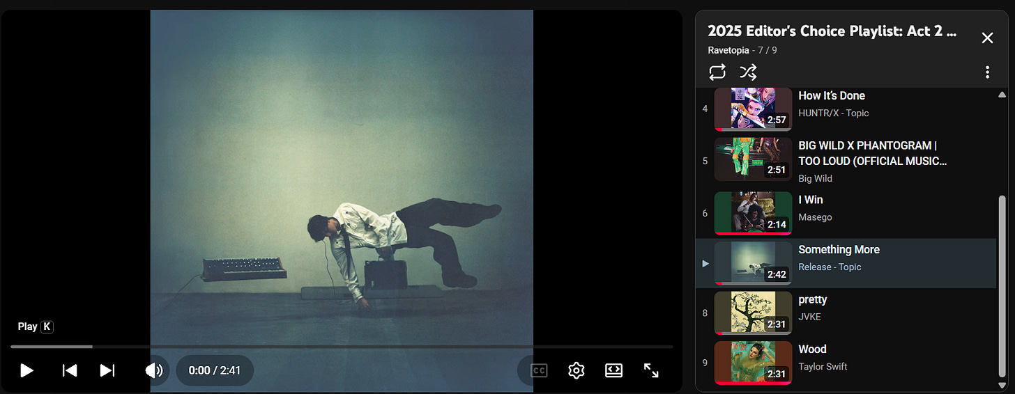 As Track 9, it works like a landing. Not a bleak ending, a grounded one, the kind where you stumble a little, laugh at yourself, and realize the fall was part of the choreography. After the reaching of “Something More” and the glossy tension of “Pretty,” “Wood” brings the palette back to earth with grain, knots, weight, consequence. It leaves you with the sense that Act 2 wasn’t just a run of songs, it was a movement from momentum into meaning, with a sprinkle of laughs and smiles so it doesn’t take itself too seriously.