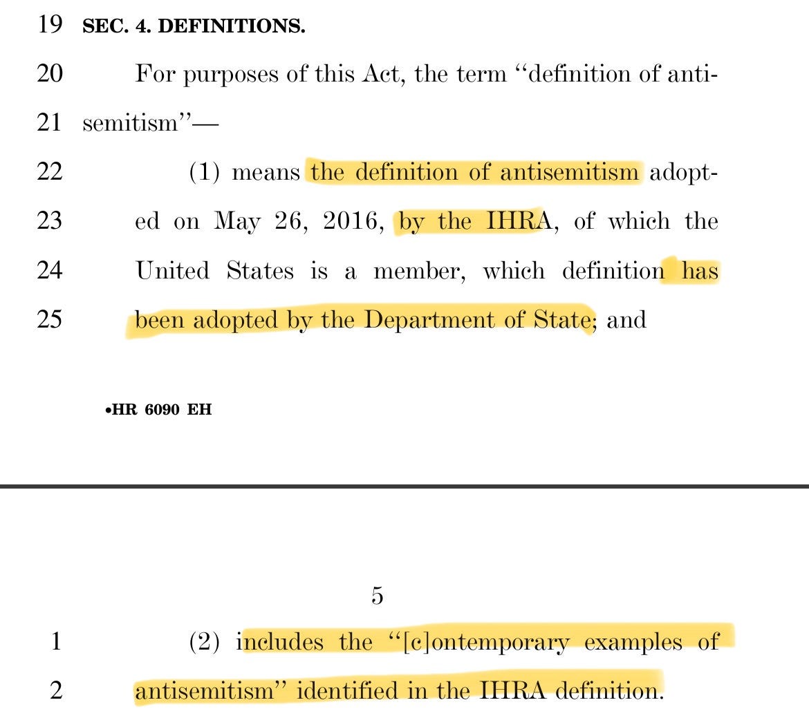 It does so by establishing a legal definition of antisemitism in accordance with the working and contemporary definitions found on the International Holocaust Remembrance Alliance website, and makes such actions a Title VI violation.