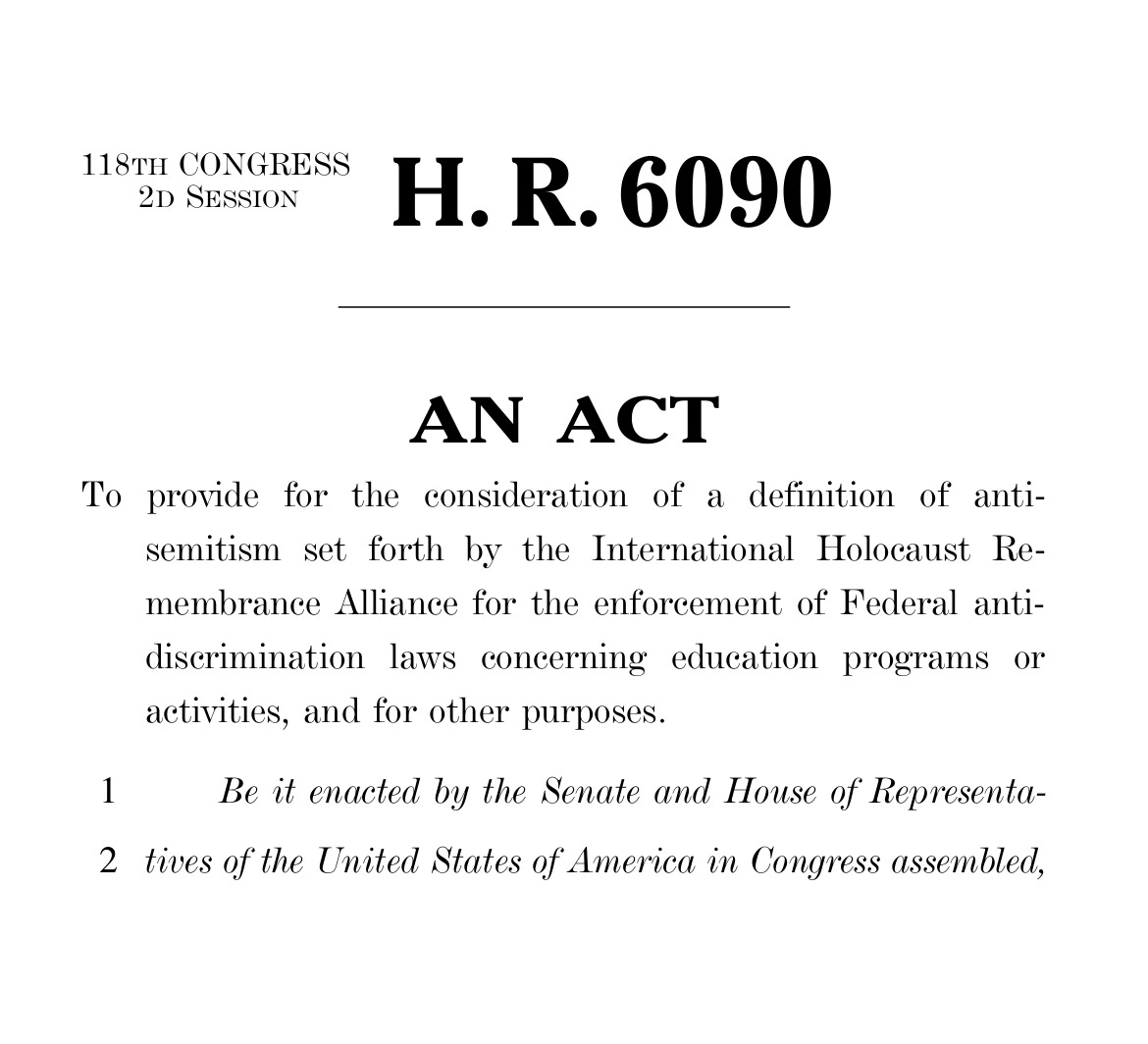 HR 6090, which has passed the House, would make The International Holocaust Remembrance Alliance’s contemporary definitions of antisemitism actionable under Title VI