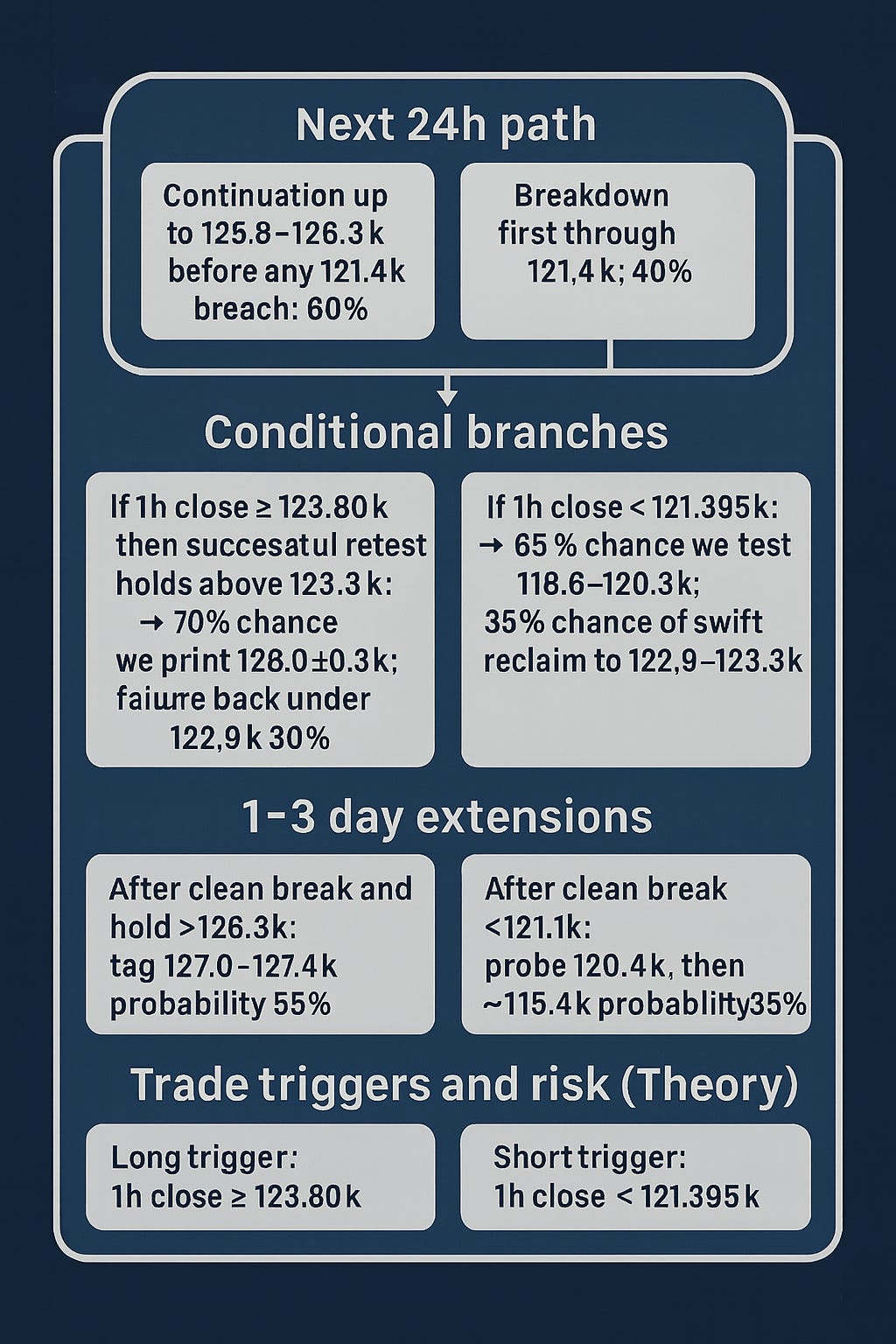 Avoid entries inside 122.9–123.3K unless closing candle confirms break. Trail profits by 1 × ATR. Move stop to breakeven after first target.