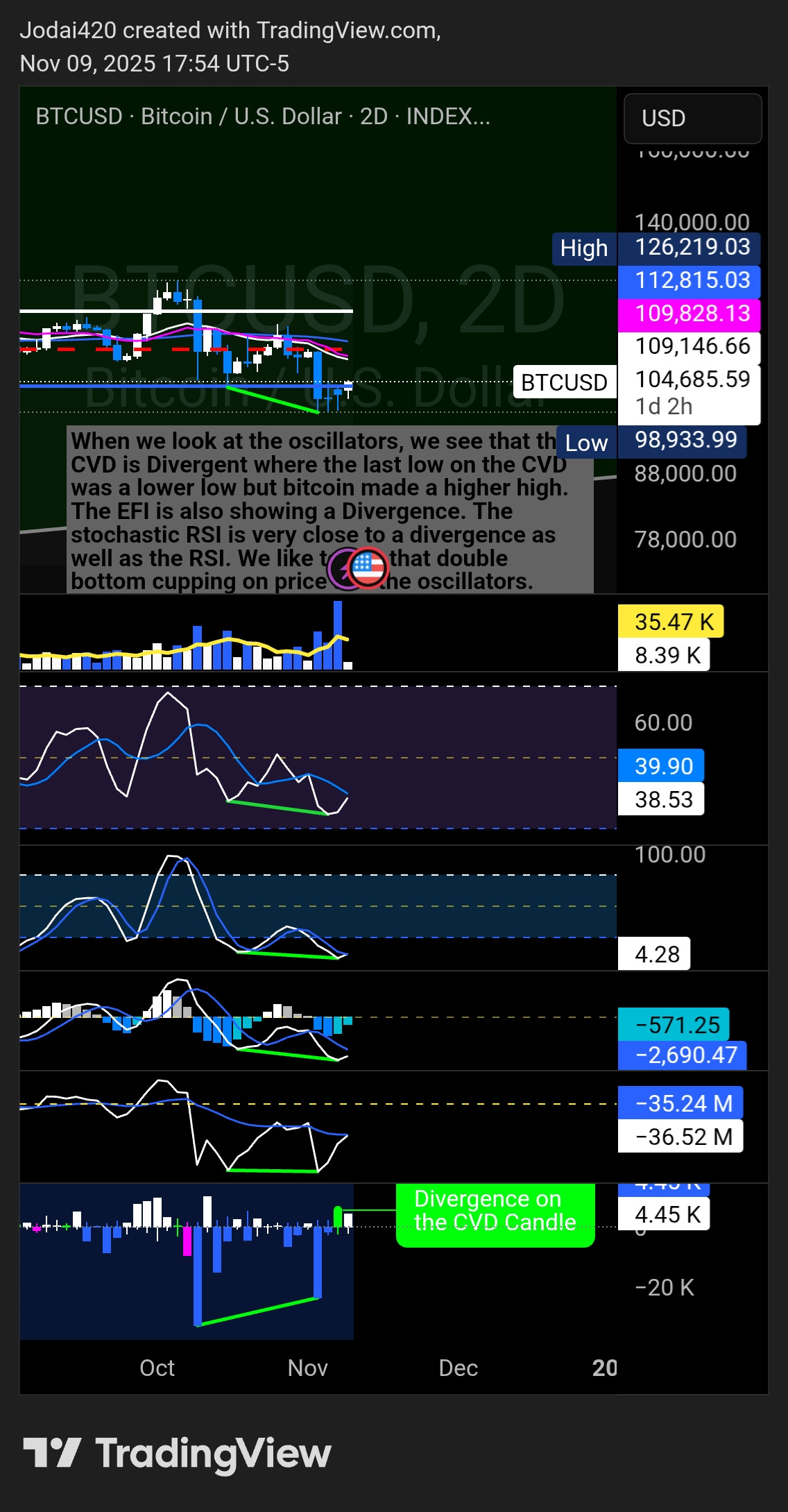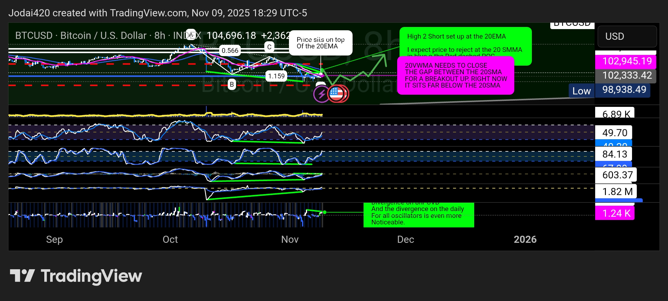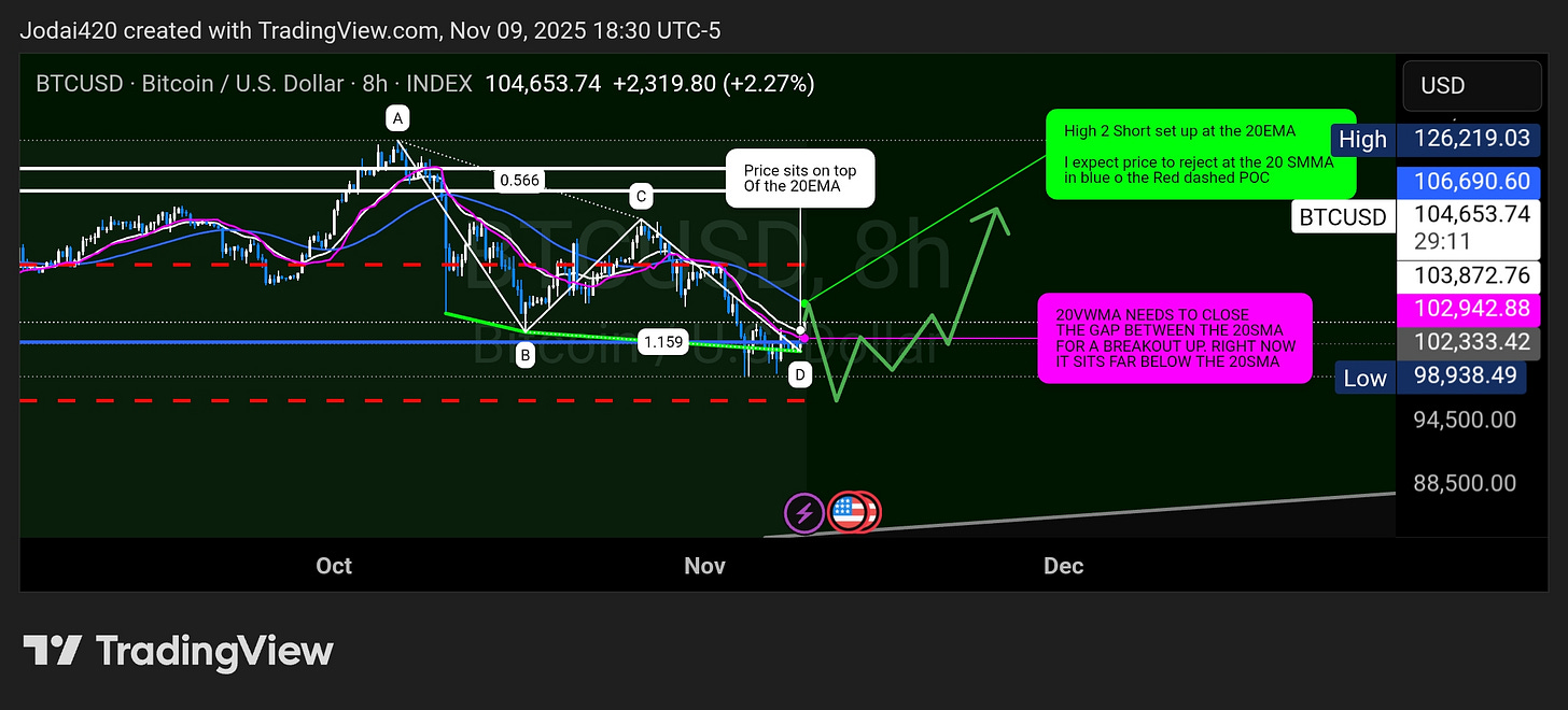 Higher-TF context: 2-day shows RSI/EFI/CVD bullish divergences from early-Nov lows; 8-hour sits near 20-EMA with prior “H2 short @ 20-EMA” risk callout. [Fact]