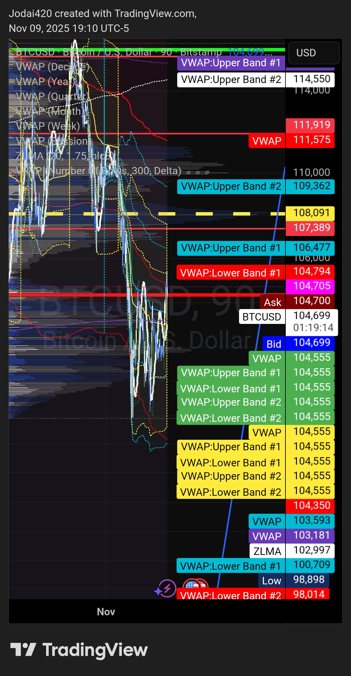 VWAP stack (90m): Session VWAP ≈ 104,555; UB1 106,477; LB1 104,350; weekly/monthly VWAPs ~103,59x / 103,181; ZLMA ~102,997. [Fact]