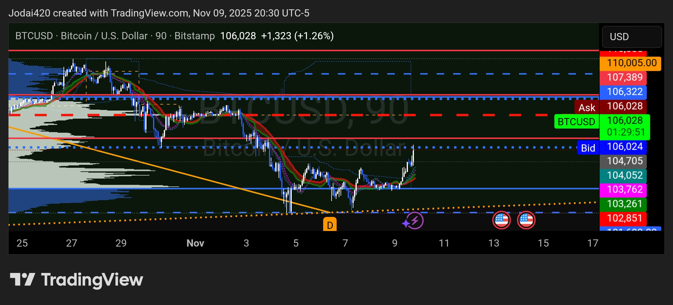 TP ladder: 105,476 → 106,477 (VWAP-UB1) → 107,389/108,091 (VRVP POC) → stretch 111,575–111,919 (VWAP/UB2). [Theory]