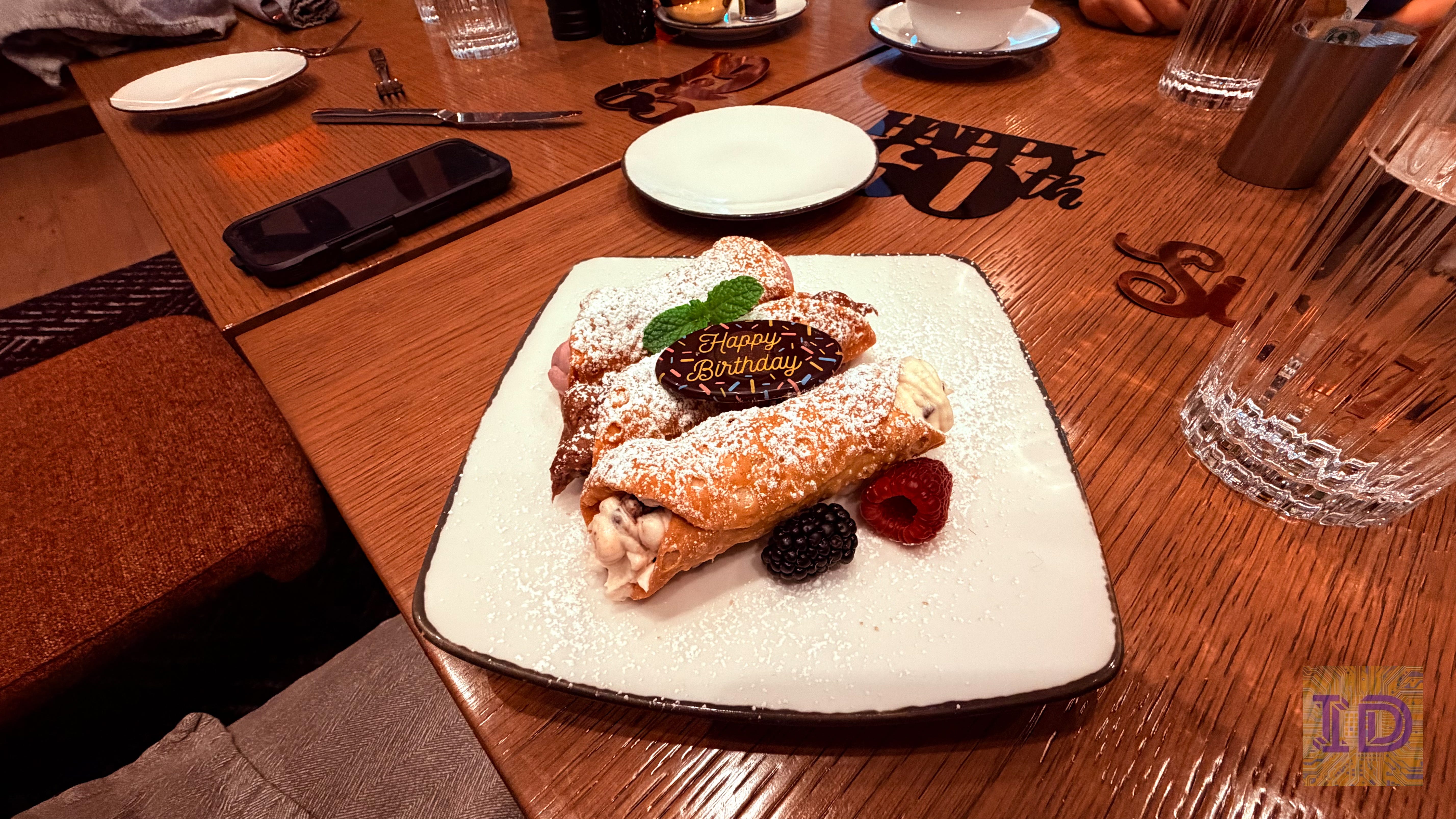 For the birthday in the group, the kitchen sends out a complimentary cannoli, plated with a dark chocolate “happy birthday” sign you can actually eat. The filling comes in three distinct flavors across the shared dessert experience, lemon ricotta with chocolate chips, raspberry, and hazelnut. Each is solid, classic rather than showy, the kind of pastry that makes sense at the end of a hotel brunch where the goal is warmth over spectacle.