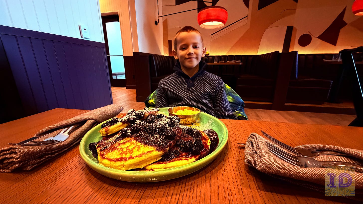 The food follows the grammar of comfort, upgraded just enough to feel like an occasion. Orion went straight for blueberry pancakes, I chose the caramel apple French toast.