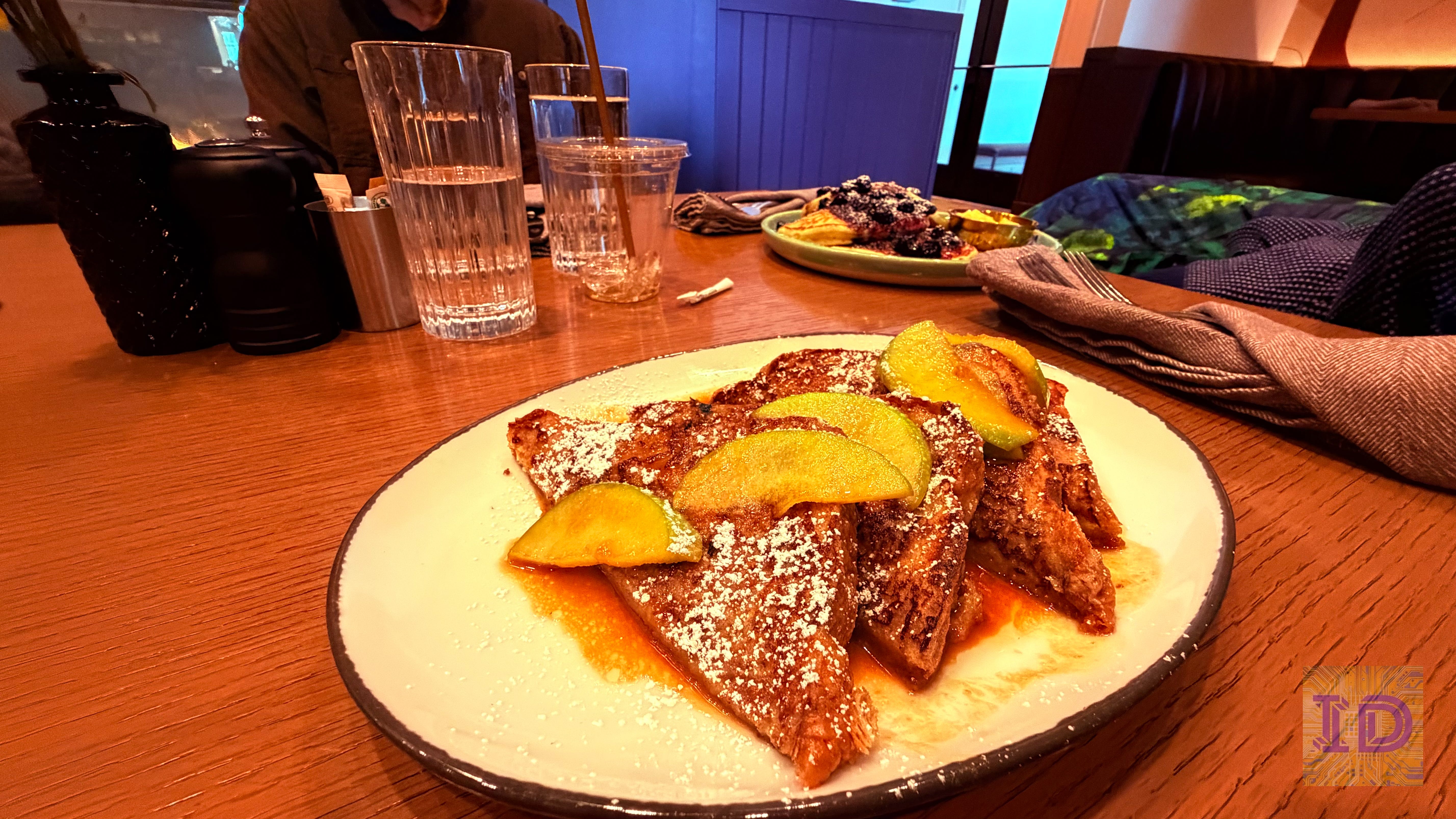 My French toast leaned into nostalgia but with a little restraint. Thick slices are drenched in caramel glaze and topped with green apples cooked to the exact right point, softened yet still holding a distinct bite. That bit of resistance keeps the sweetness from overwhelming everything, a sharp, tart edge meeting the sugar halfway. It is not revolutionary, but it is clearly thought through.