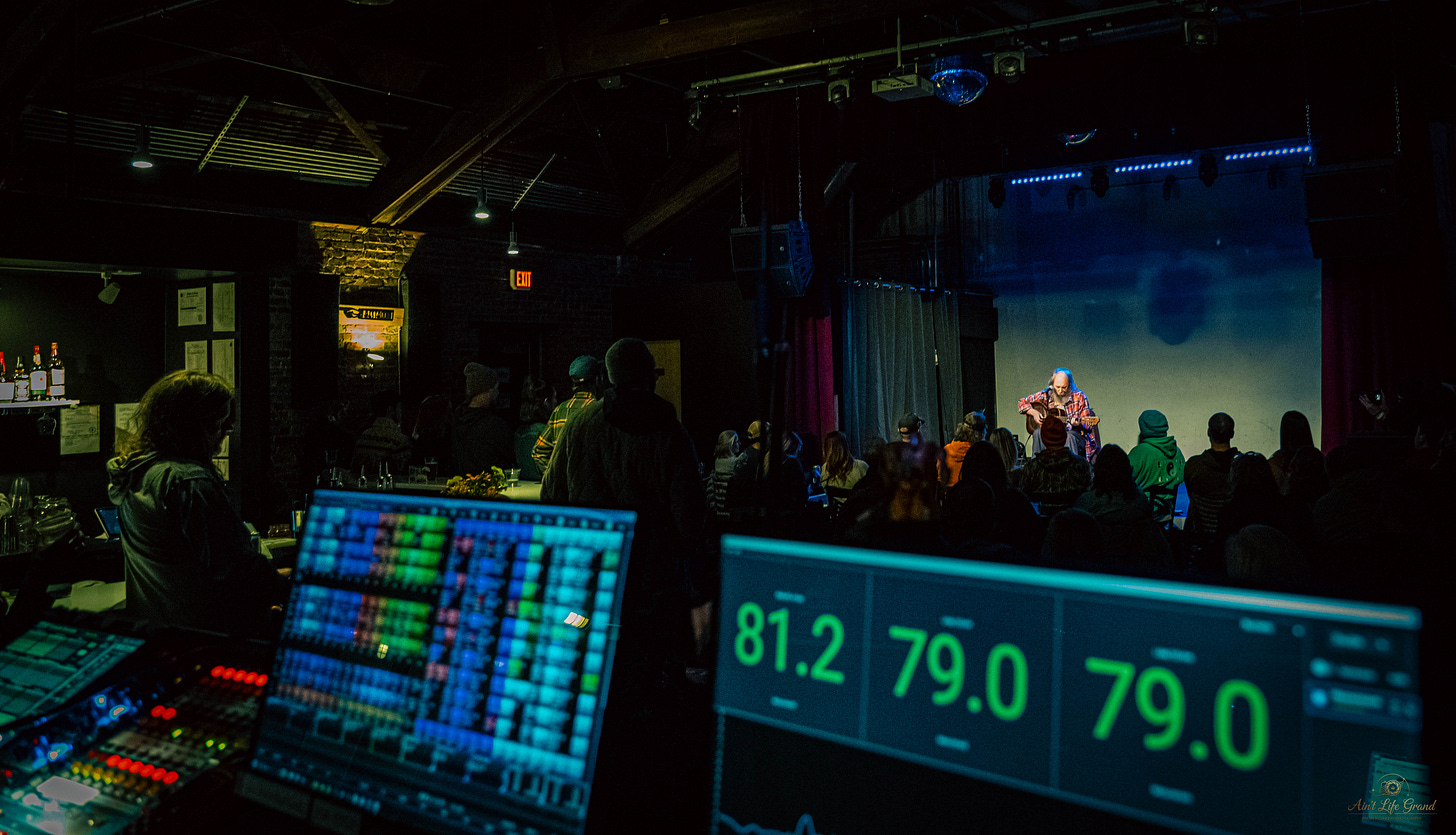 There’s always more happening than what’s on stage. Brian Dodson behind the board, making everything feel effortless, bourbon shots appearing, homemade cookies making the rounds. Conversation drifts toward the Iowa Musicianship project, a snapshot of the local scene through Mark Lage’s lens.