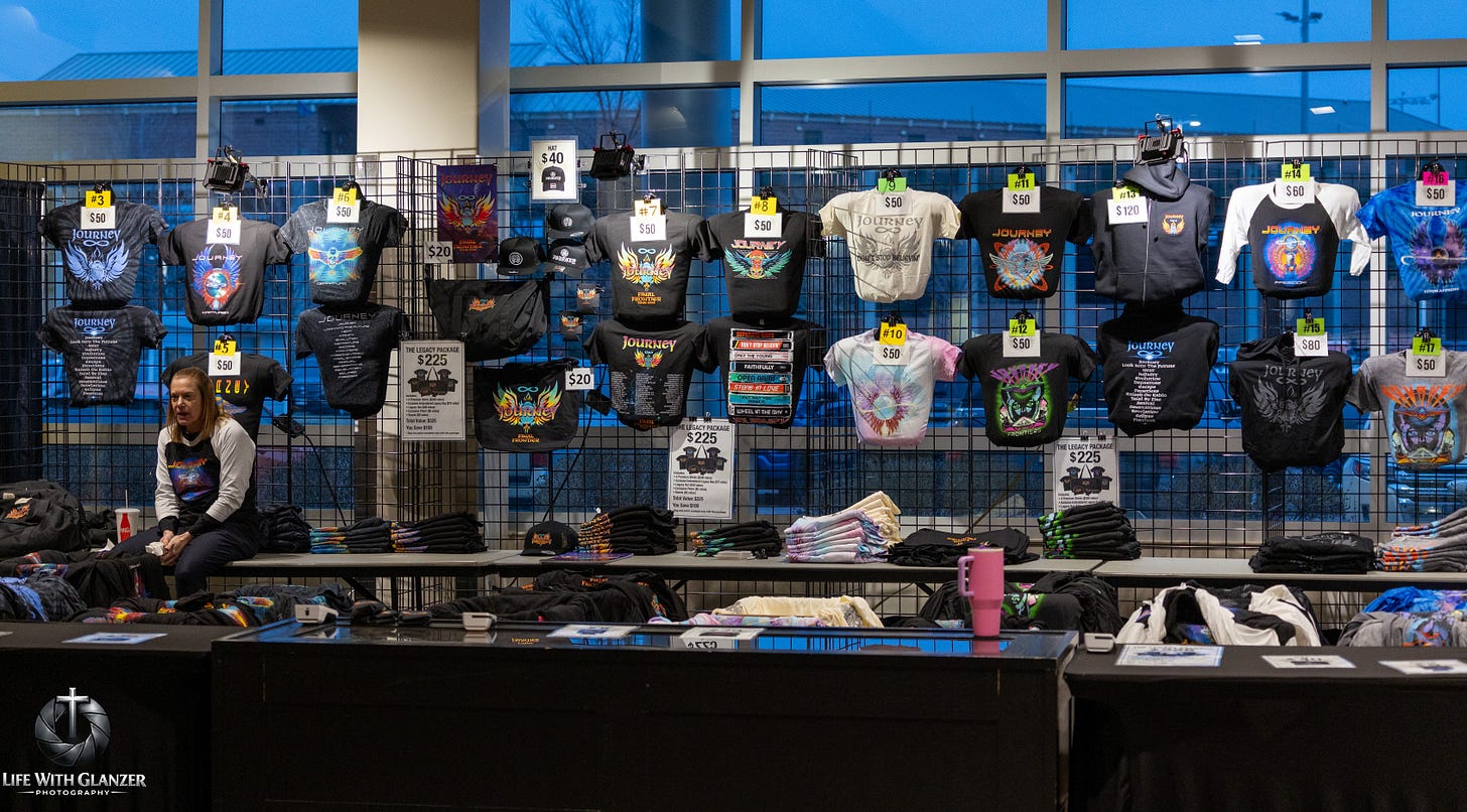 Lined end to end with black tees, neon prints, tour dates, and that unmistakable winged Journey iconography, it looked less like a sales table and more like a timeline you could wear home. Designs pulled from different eras, different albums, different identities of the band all sitting side by side. You could almost trace their evolution just by walking from left to right.