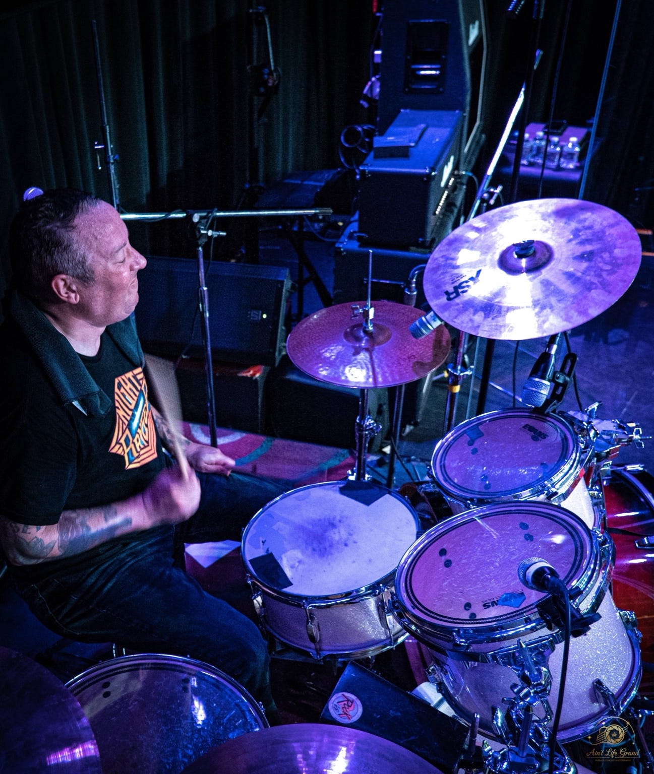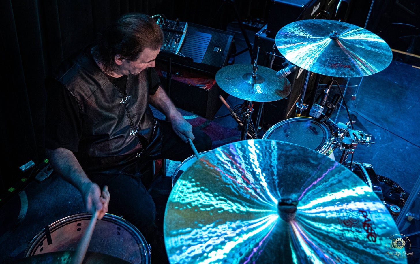 The drummer, tucked behind his kit, kept the pulse steady with that perfect blend of control and chaos — every crash, every tom hit, precise and primal all at once.
