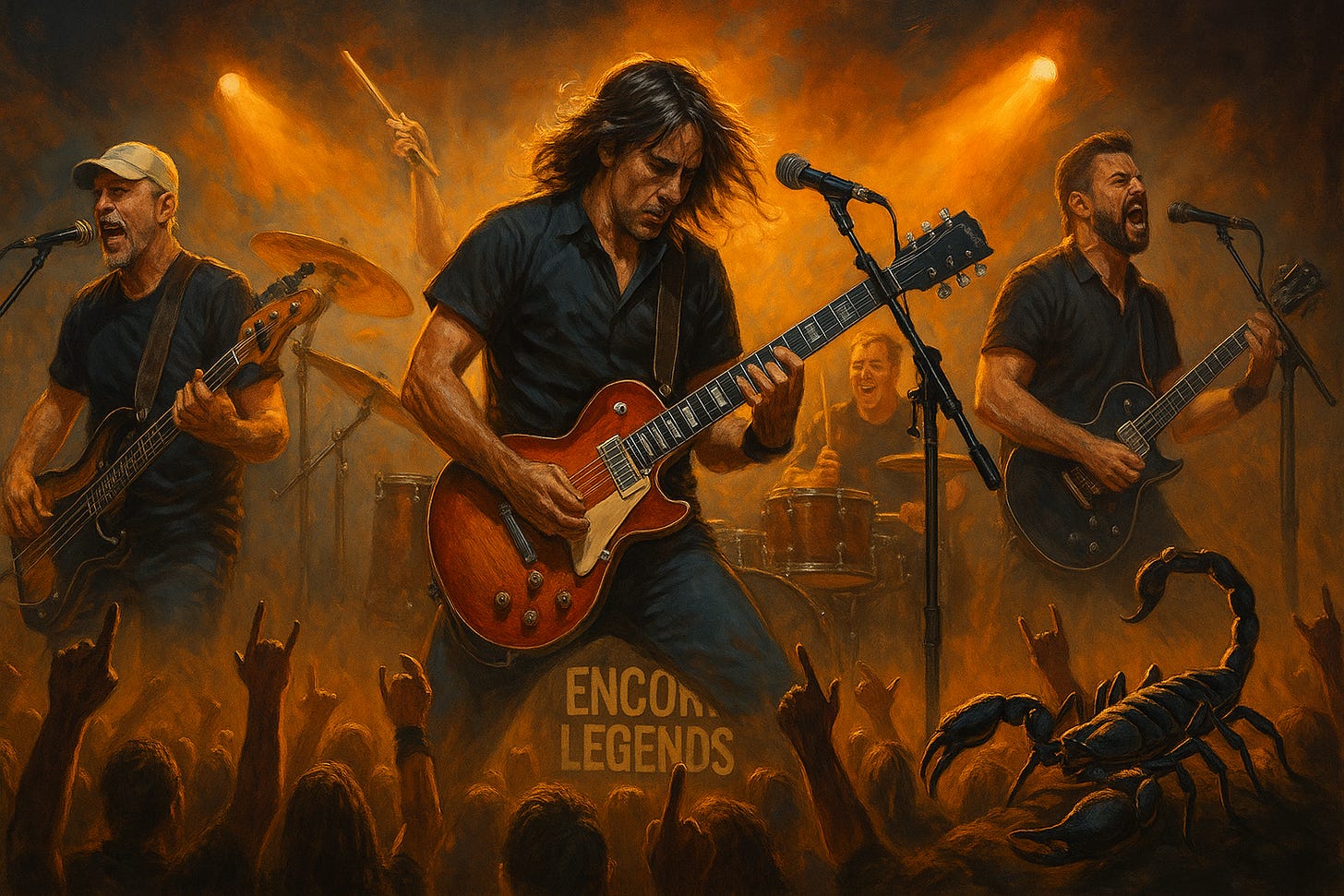 From the opening riff, it was clear these guys didn’t just cover Scorpions songs — they inhabited them. The lead vocalist, swaggering in his hat and chains, commanded the mic with that classic rock showmanship you can’t fake. Every note, every pose, felt pulled from a time when arenas were smoke-filled and guitars ruled the airwaves.