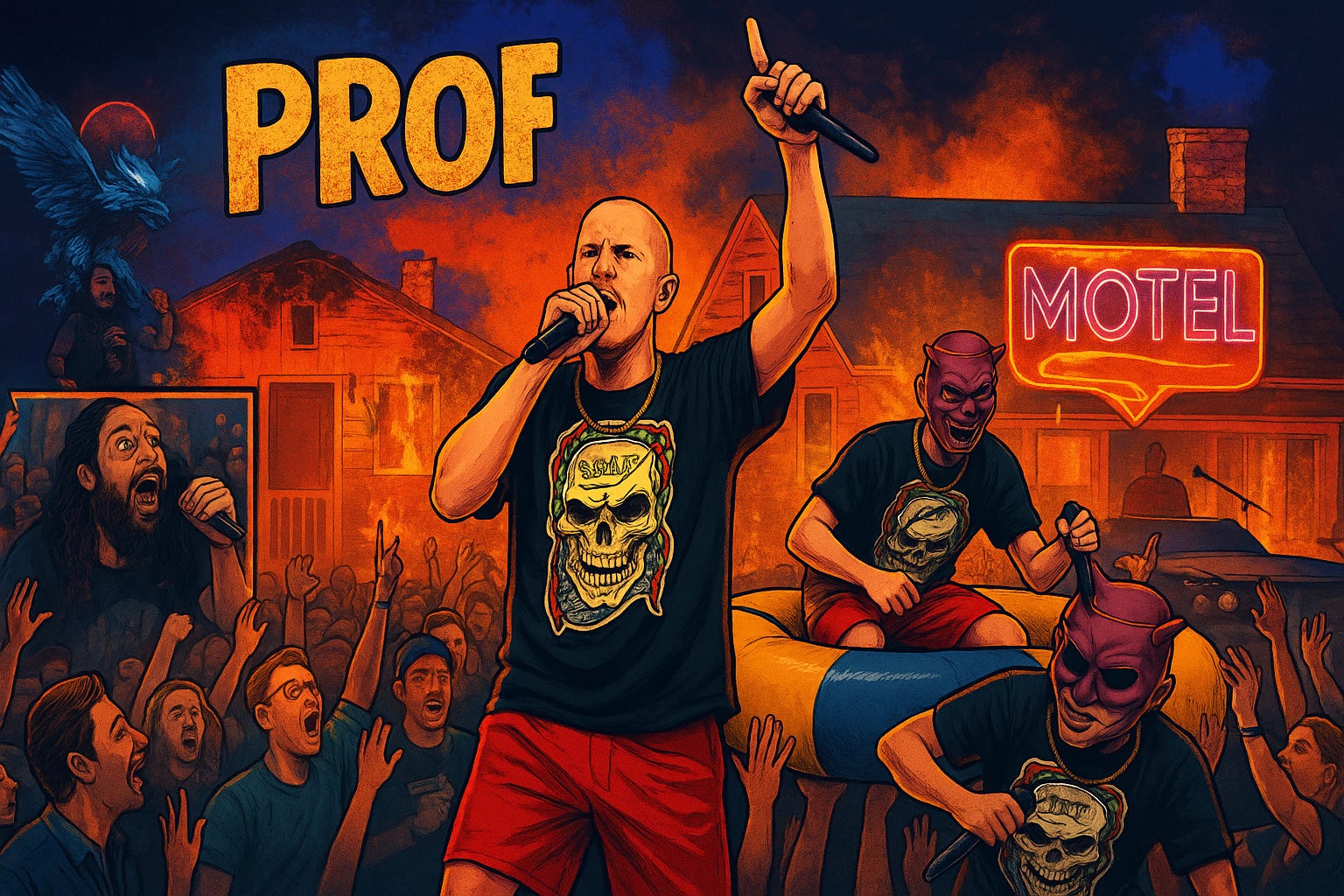 Every Prof record carries a Minneapolis watermark. The city’s hip-hop lineage — DIY grit, absurdist humor, and genre-crossing confidence — shows up in his palette. His music feels like the Midwest itself. It’s weathered, self-aware, and unwilling to take itself too seriously. He’s always been the comedian who bleeds onstage between punchlines.