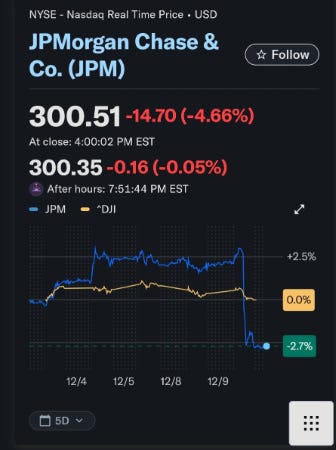 JPMorgan Chase dropped about 4.7% in one session, its sharpest one-day decline since early April, closing around $300.5 and finishing as the biggest loser in the Dow Jones Industrial Average. (Yahoo Finance)