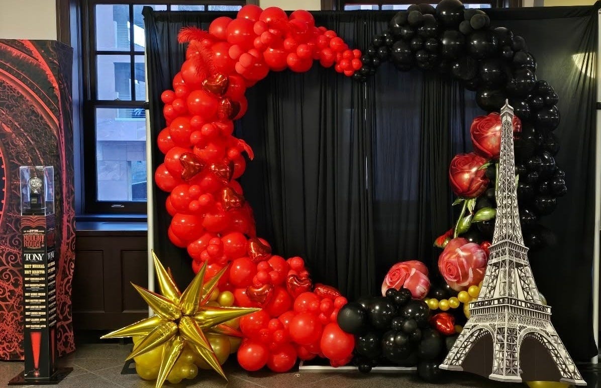 Before anyone sang a note, the Washington Pavilion was already doing the work of world-building. The entry décor leaned hard into Moulin Rouge colors and Valentine’s Day energy without feeling like a random heart-bombing. A massive balloon installation curled across a black backdrop like a split personality, half red and half black, studded with shiny heart balloons and oversized roses. A cutout Eiffel Tower stood guard at the edge like a postcard come to life, and a gold starburst balloon flashed at floor level like the whole lobby had its own spotlight. Even the Tony display near the entrance felt less like trivia and more like a little shrine to spectacle. You’re not walking into a neutral building. You’re walking into the pre-show.