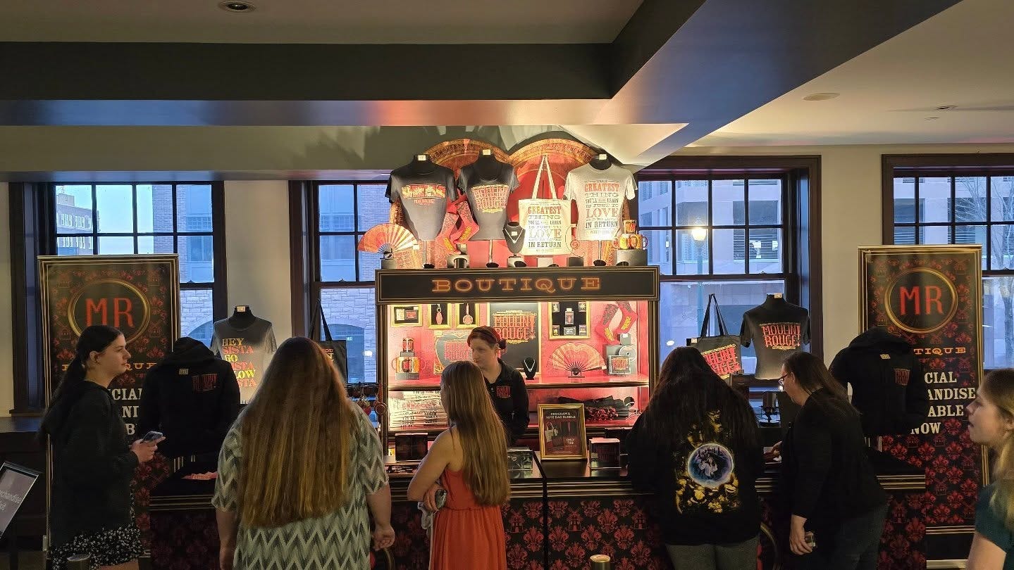 And then there was the merch table, dressed up as the “MR Boutique,” lit like its own miniature set. Shirts and hoodies hung like souvenirs from a glamorous heist, posters framed the booth like club signage, and the crowd gathered the way they do outside a good bar, half shopping and half soaking in the mood. It’s a smart choice for this show. Moulin Rouge sells excess as an invitation, and the Pavilion met it halfway. By the time I found my seat, the night already felt like it had started.