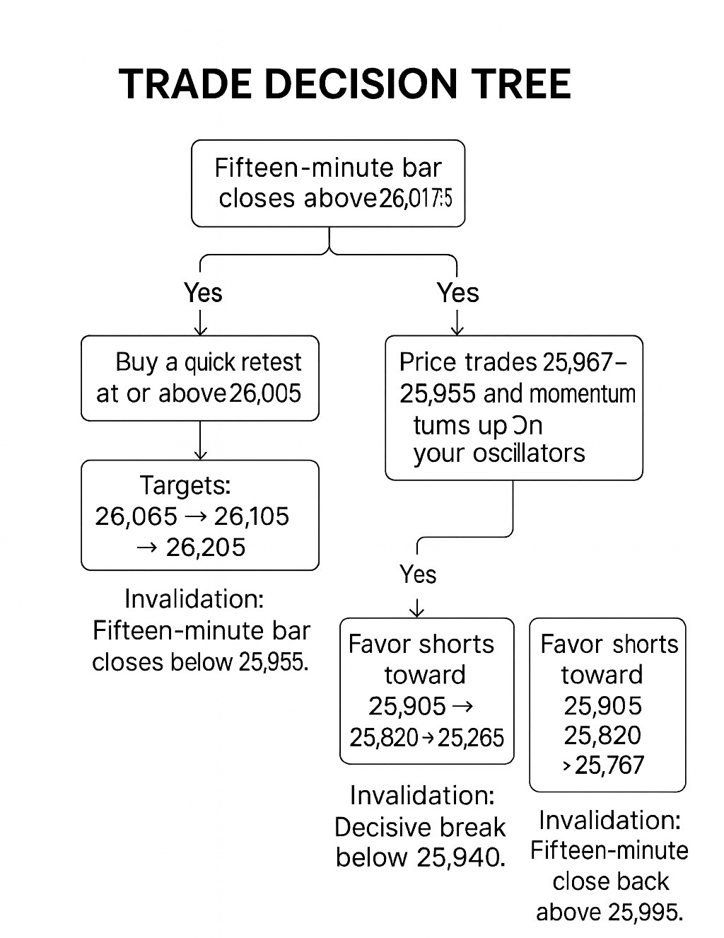 If a fifteen-minute bar closes above 26,018.75 and a quick retest holds at or above 26,005, favor buying the retest for continuation toward 26,065, then 26,105, then 26,205. Invalidate if a fifteen-minute bar closes below 25,955. [Theory]