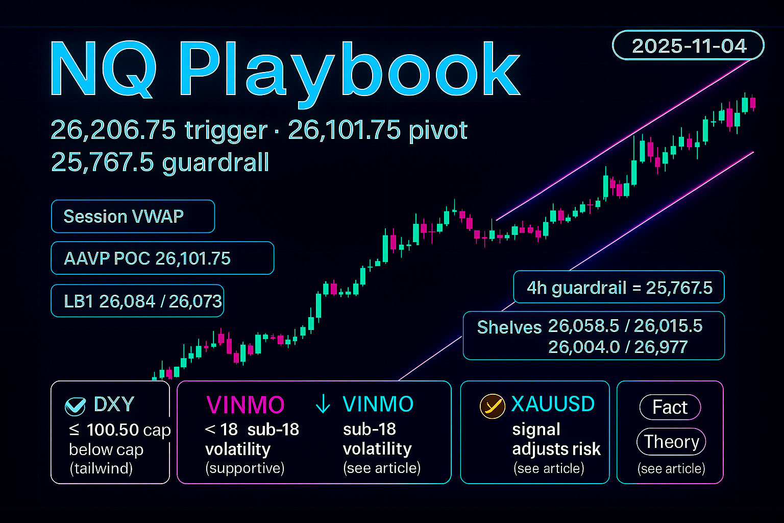 We build directly on NQ Futures Playbook: Trigger 26,018.75, Pivot 25,955, Guardrail 25,767.5 (11/03/2025). Two improvements today: