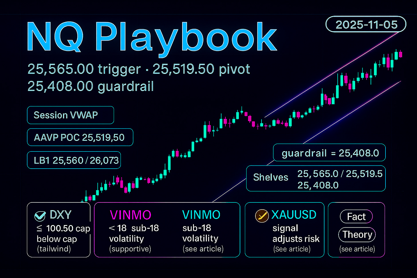 We continue from NQ Futures Playbook: Trigger 26,018.75, Pivot 25,955, Guardrail 25,767.5 (11/04/2025), which framed directional bias around a higher trigger and a four-hour trend guardrail. The improvement today is a tighter, session-driven map: we explicitly designate the five-minute volume profile’s value-area high, point of control, and value-area low as trigger, pivot, and guardrail. This simplifies execution, reduces discretion at the edges, and shortens the feedback loop to the fifteen-minute close and retest logic.