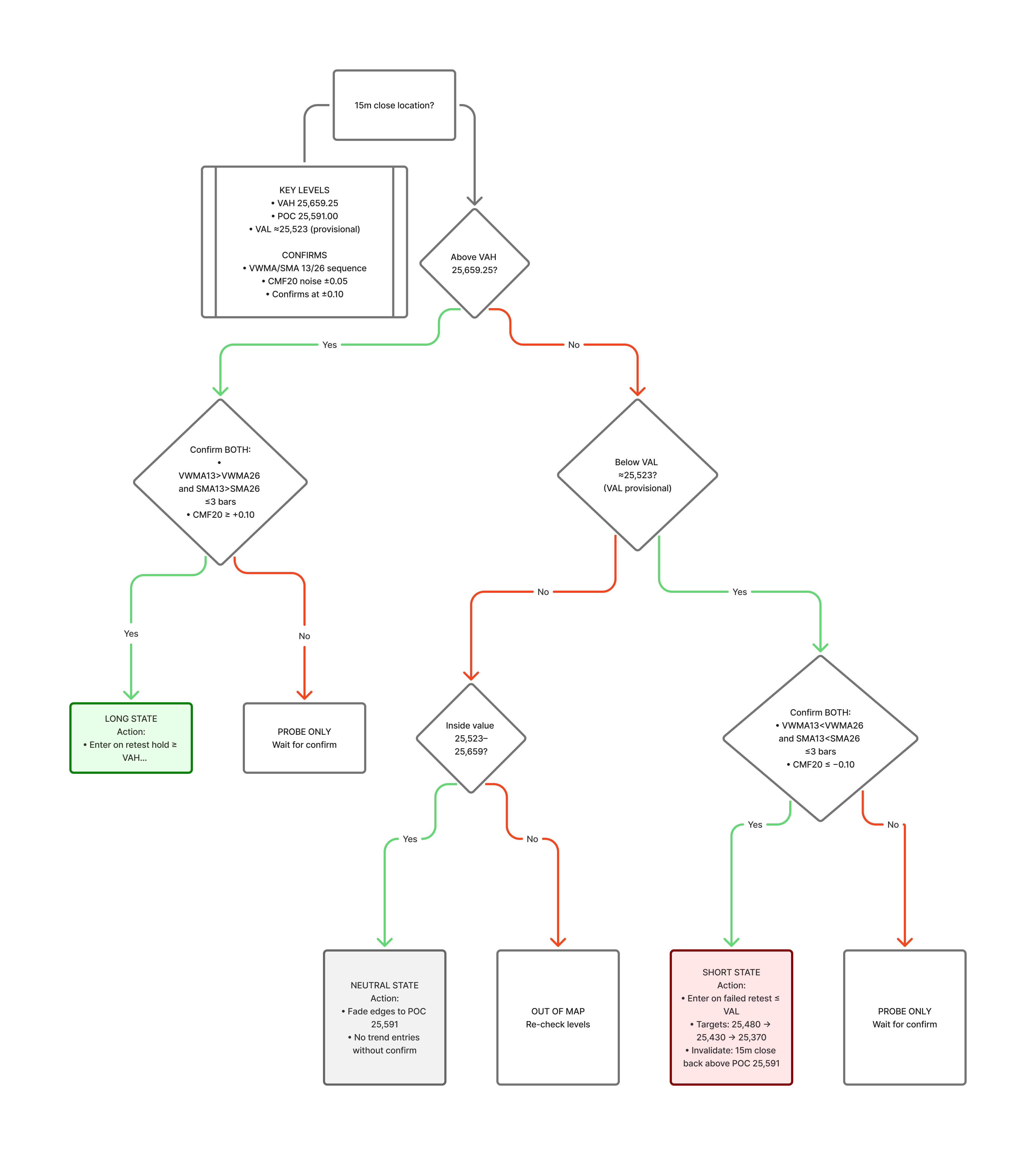 If a fifteen-minute bar closes above 25,659.25 and a quick retest holds at or above 25,659.25, consider a long for continuation toward 25,700, then 25,760, then 25,880. Invalidate the idea on a fifteen-minute close back inside value. Require CMF(20) ≥ +0.05 and the VWMA/SMA confirmation sequence.