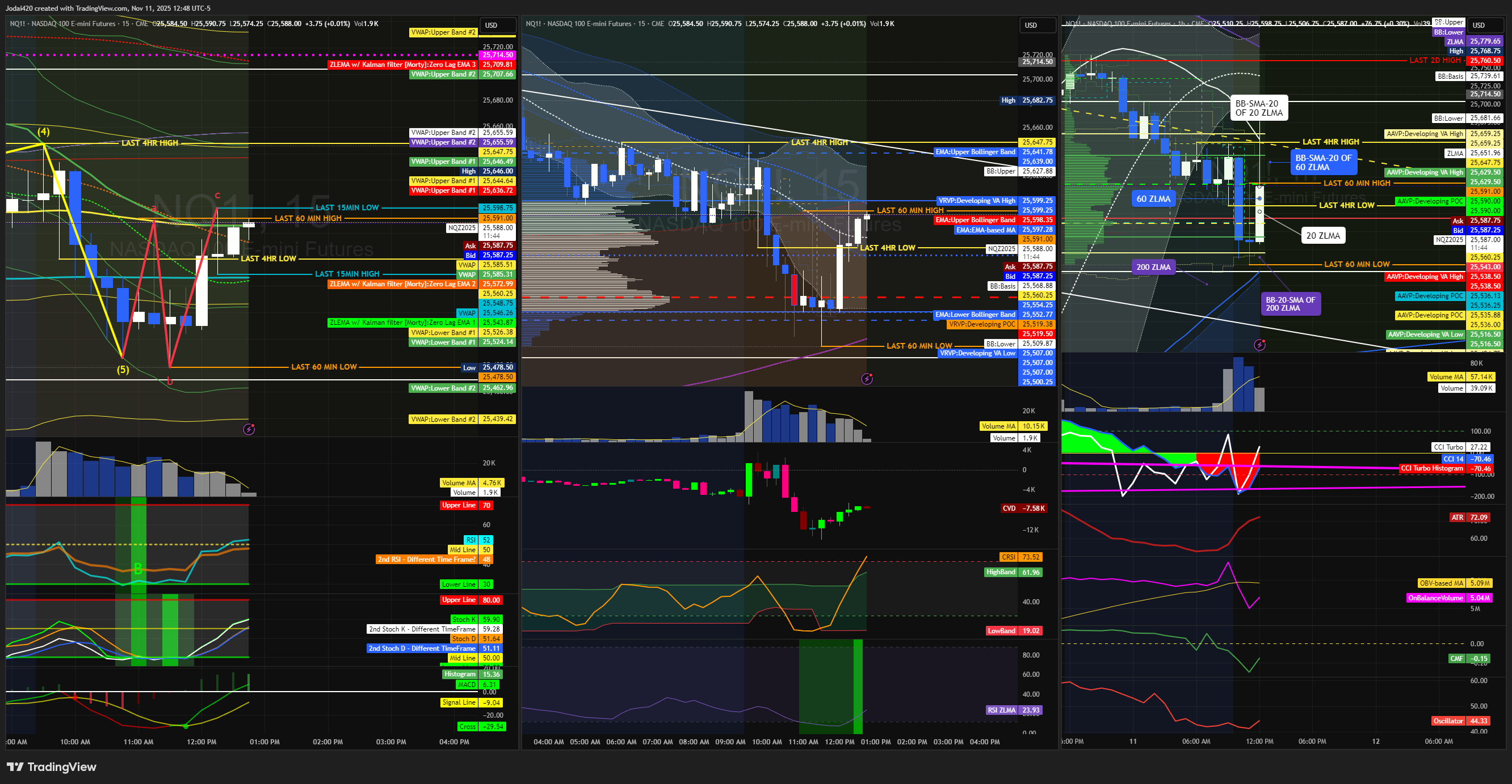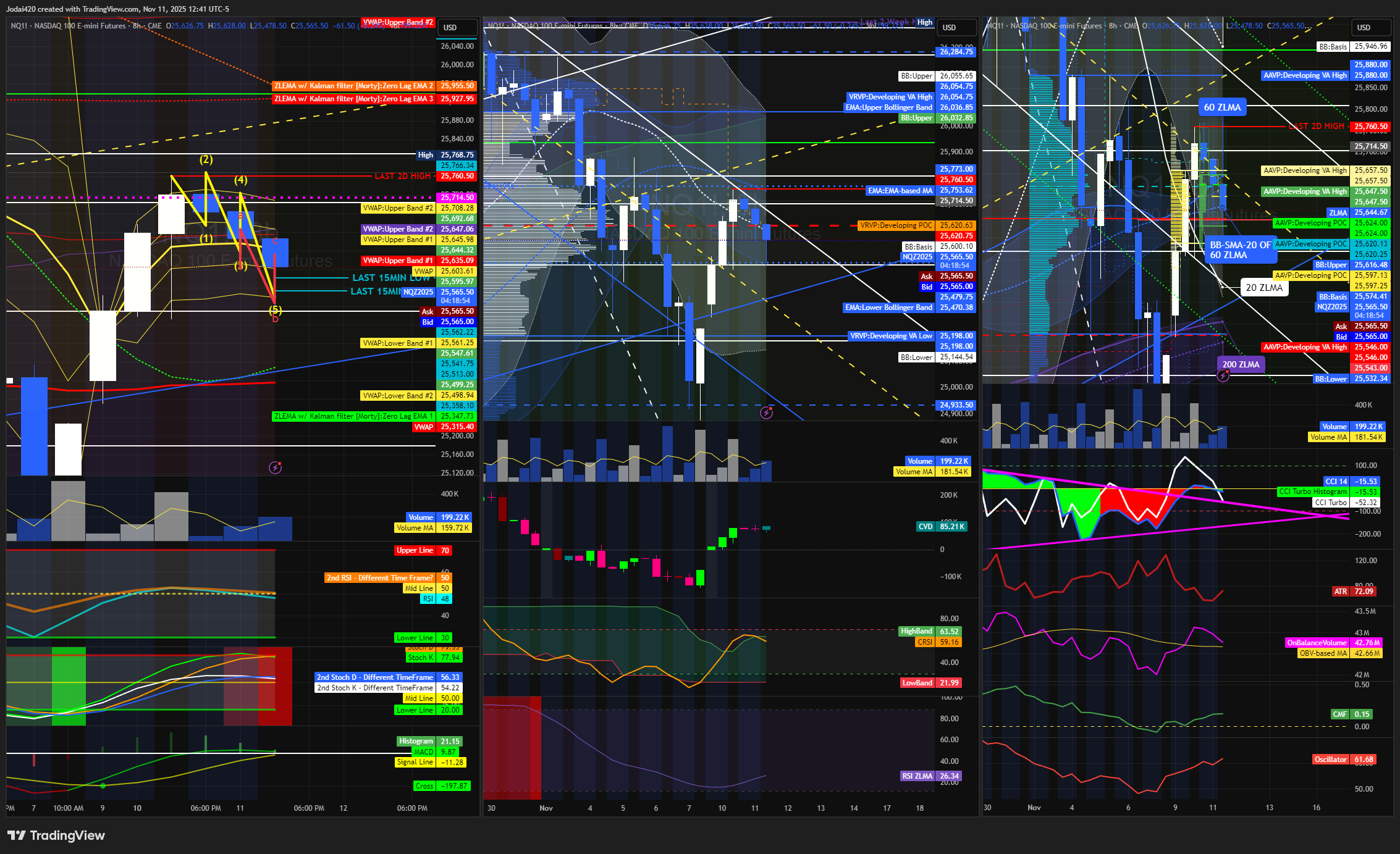 Lets take a look at yesterday’s post “NQ Futures Playbook — 25,597.25 trigger, 25,955 pivot, 25,480.00 guardrail (11/10/25)” posture emphasized trading “inside value back to POC” unless the value-area edges broke on a closing basis. Market behavior remained rotational, validating the emphasis on mean-reversion tactics and patience at the edges.