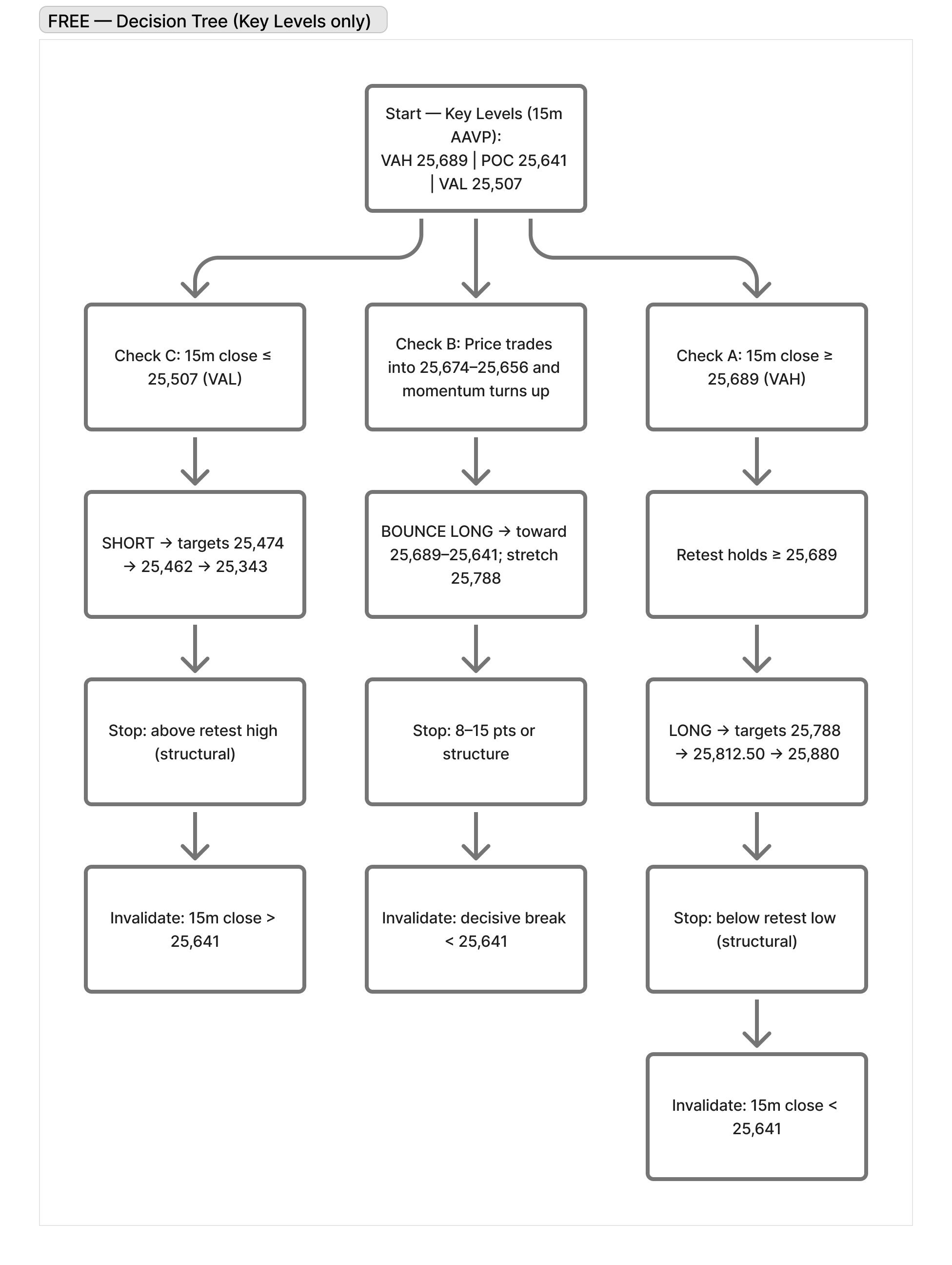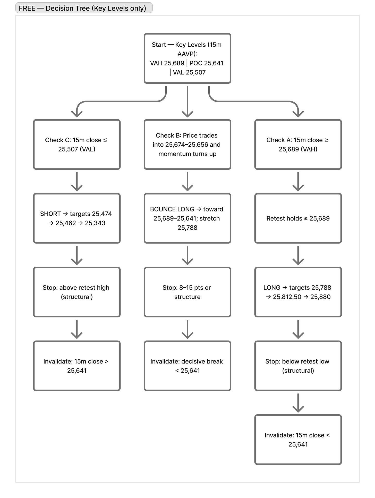 If a fifteen-minute bar closes above 25,689 and a quick retest holds at or above 25,689, consider a long for continuation toward 25,788, then 25,812.50, then 25,880. Invalidate on a fifteen-minute close back below 25,641.