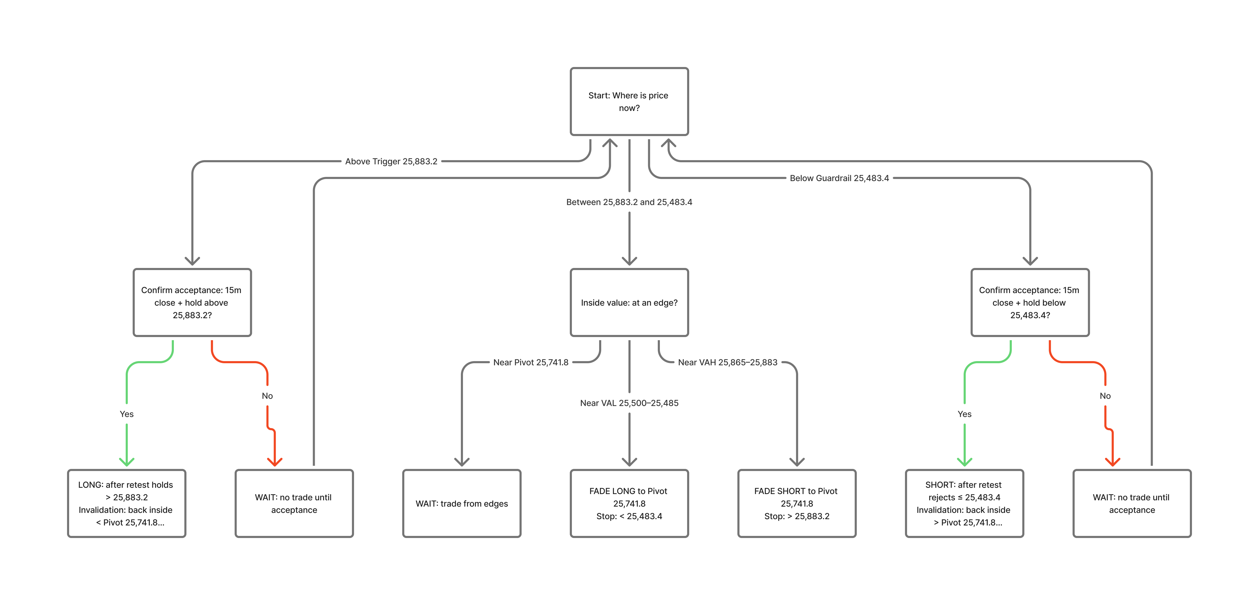A fifteen-minute close and quick retest that holds above 25,883.2 opens continuation higher; loss and acceptance below 25,483.4 favors continuation lower. [Theory]