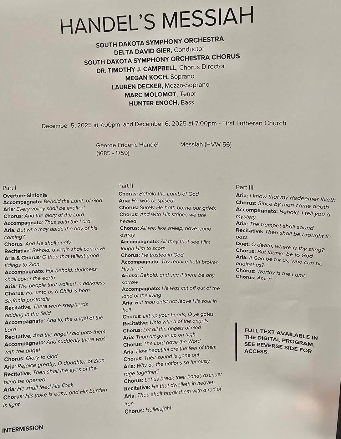 “Messiah” is laid out in three Acts (or Parts): prophecy and birth, suffering and “Hallelujah,” then resurrection and triumph. The South Dakota Symphony kept that structure, as laid out on their concert page.