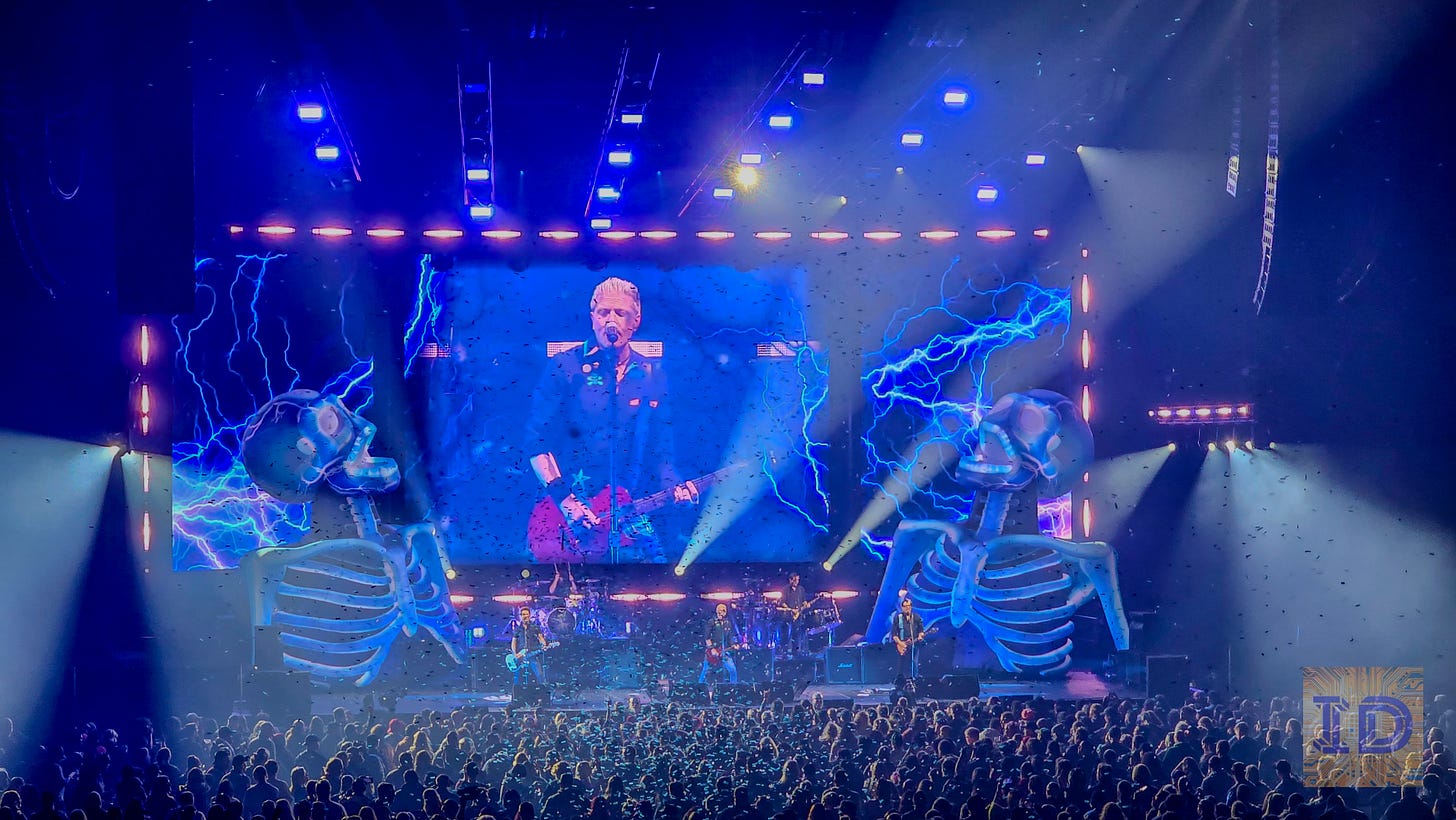 They leaned into the whole “big room entertainment” thing too. Celeb look-alikes popped up on the screens, and there was a kiss cam moment that felt less punk show and more hockey game. And weirdly, it worked. It gave the crowd a pressure-release valve before the next set lit the fuse again.