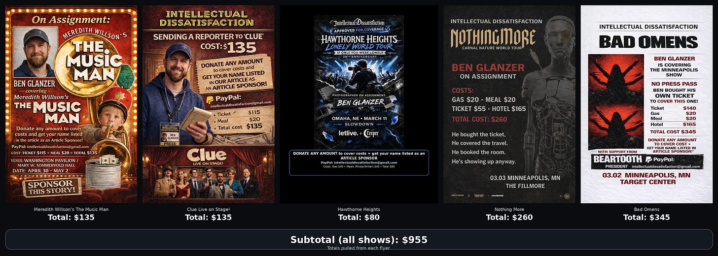 Five upcoming shows can add up to around $1,000 to cover. Tickets, travel, meals, occasional lodging, and the invisible cost people forget, time. Not just showtime. The writing time. The edit time. The photo sorting. The uploads. The back-and-forth with press contacts. The deadlines that don’t care if your week was already full.