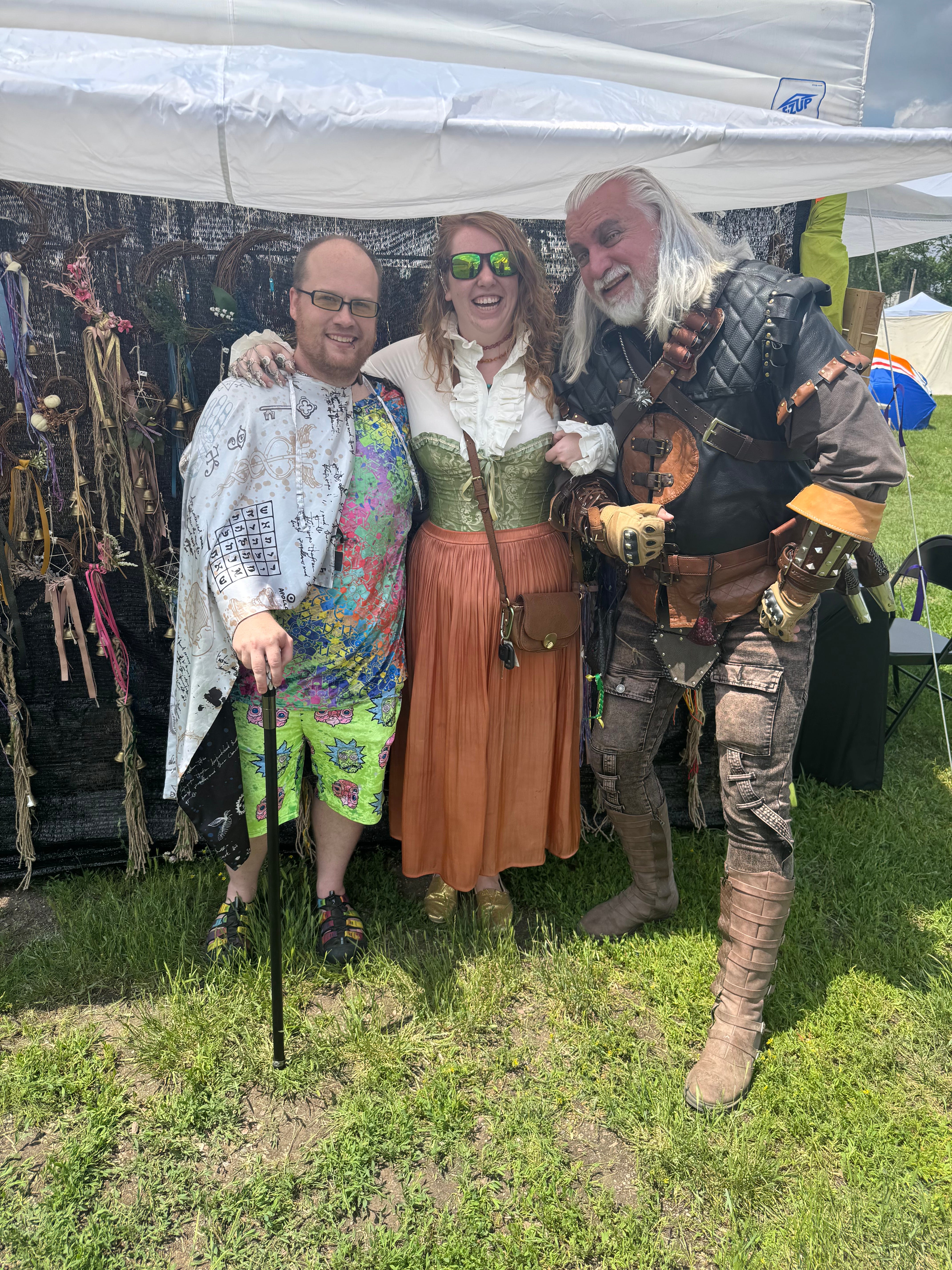 From crystal conjurers to leatherworkers, and Viking traders to enchanted scribes, the stalls were overflowing with curiosities. Among the spoils we claimed: a stylish new satchel for the fair maidens (our daughters), a captivating wolf cane sword, a beautifully crafted replica of Sting from The Lord of the Rings and The Hobbit, and a whimsical health potion drink container to toast our victories. We also paid homage to new authors of the land by acquiring their sacred scrolls (books)!